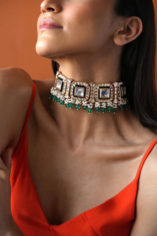 Tanisha Choker With Semi Precious Green Stones And Faux Polki Necklace Set