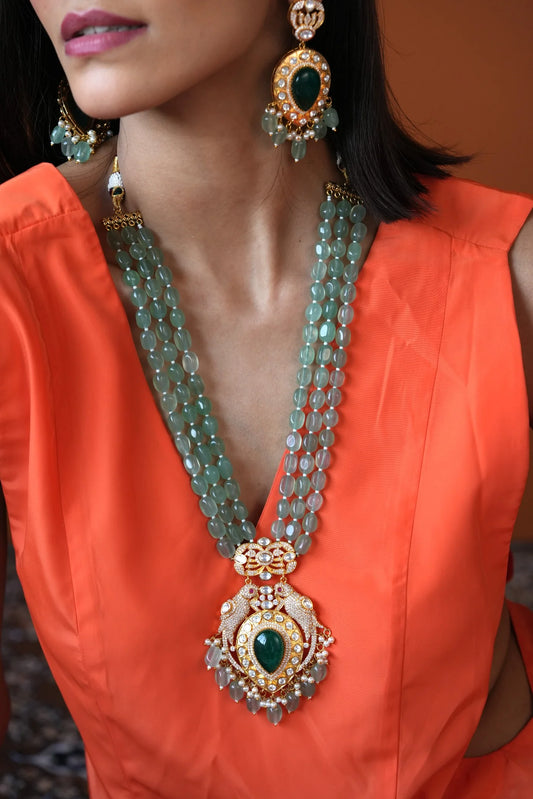 Sia Tota Green Stones Pendant On Green Mala Set With Long Earrings