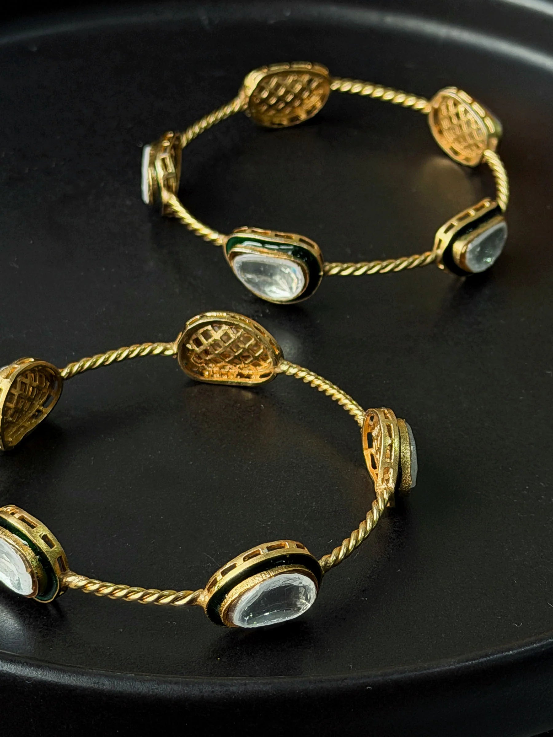 The Omira Polki SP Bangle Set showcases delicate detailing and radiant shine. Its traditional appeal and versatile elegance make it a beautiful match for weddings, festive looks, and timeless ethnic wear.
