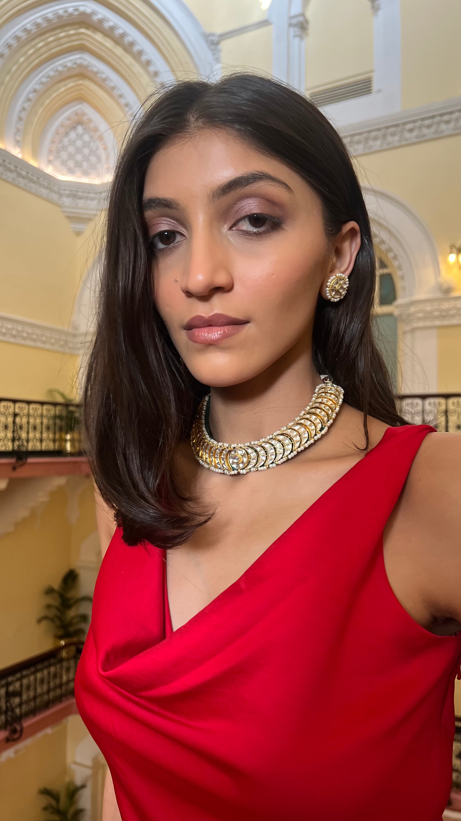 Luminous white stones intertwine with precious Basra pearls in the Devina necklace set. The artfully curved silhouette draws the eye, while coordinating stud earrings complete the refined look. This White Stone with Basra Moti Necklace Set radiates understated luxury for memorable occasions.