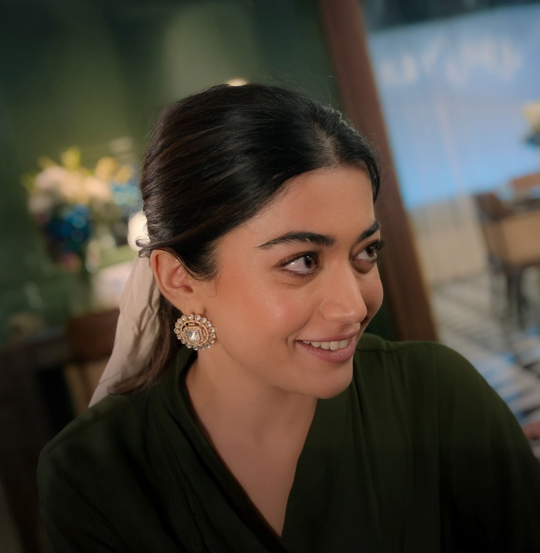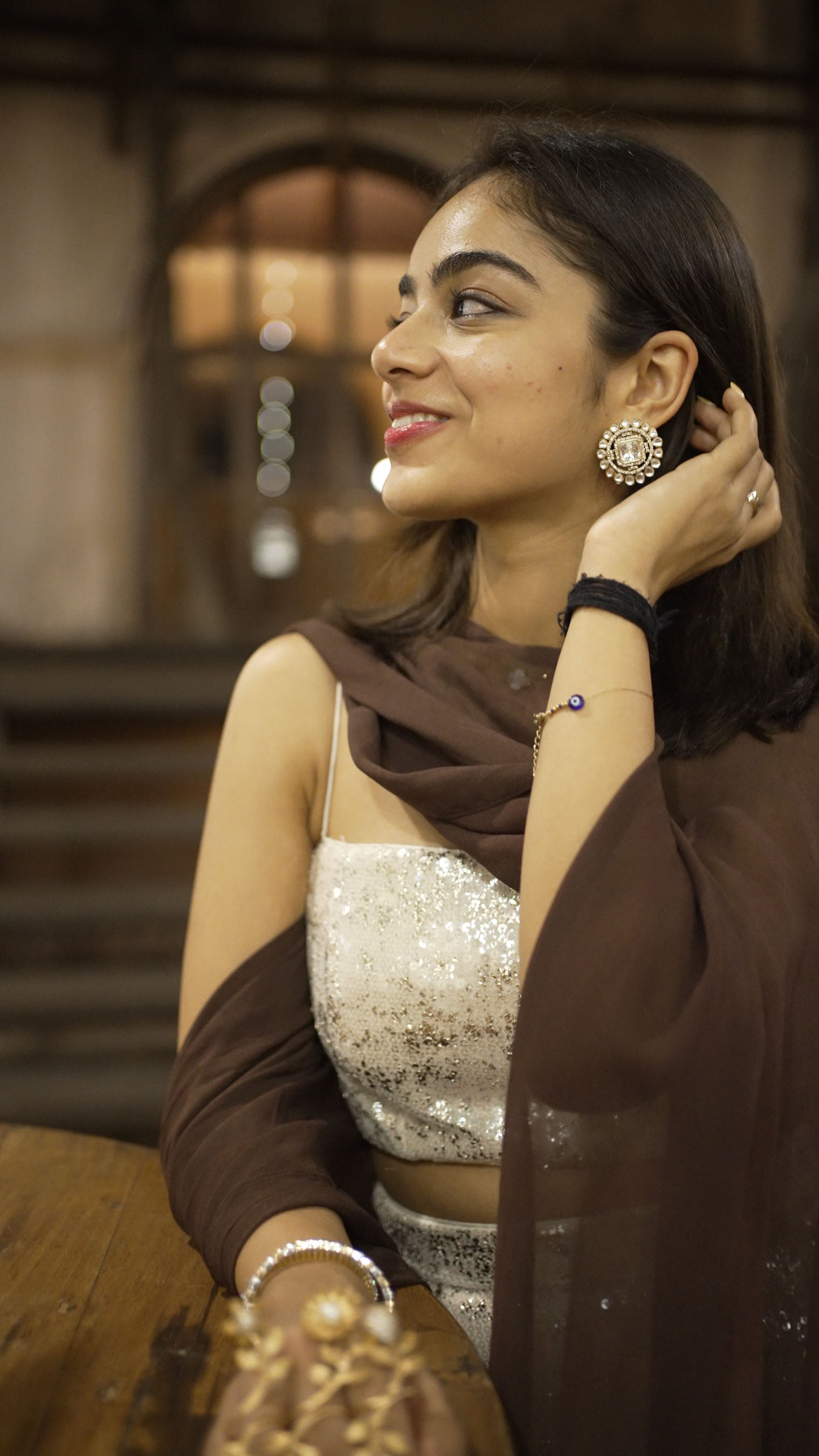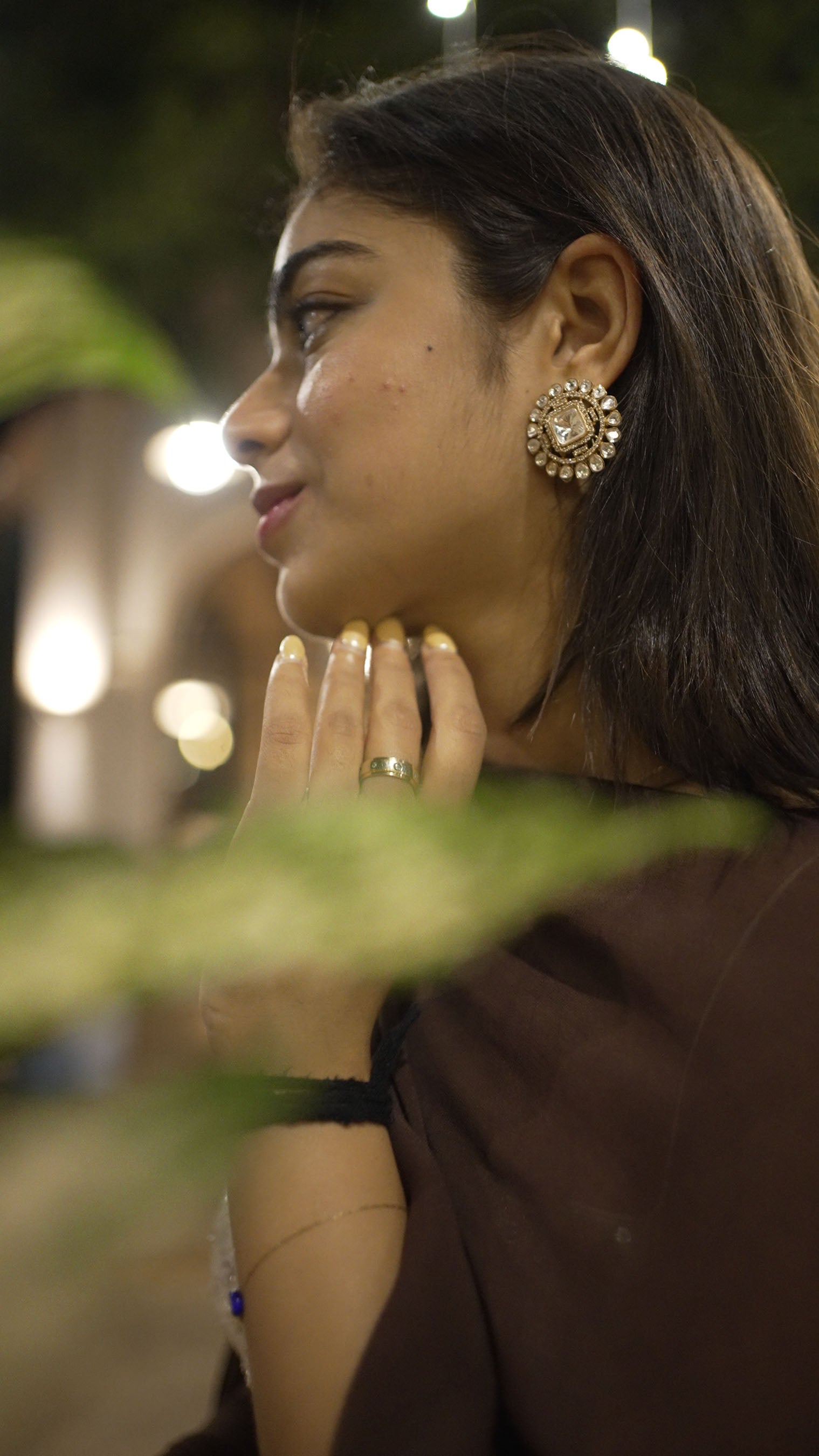 Elegant round stud earrings with a gold base, featuring a central mirror stone, surrounded by sparkling stones and pearl accents. Perfect for traditional outfits.