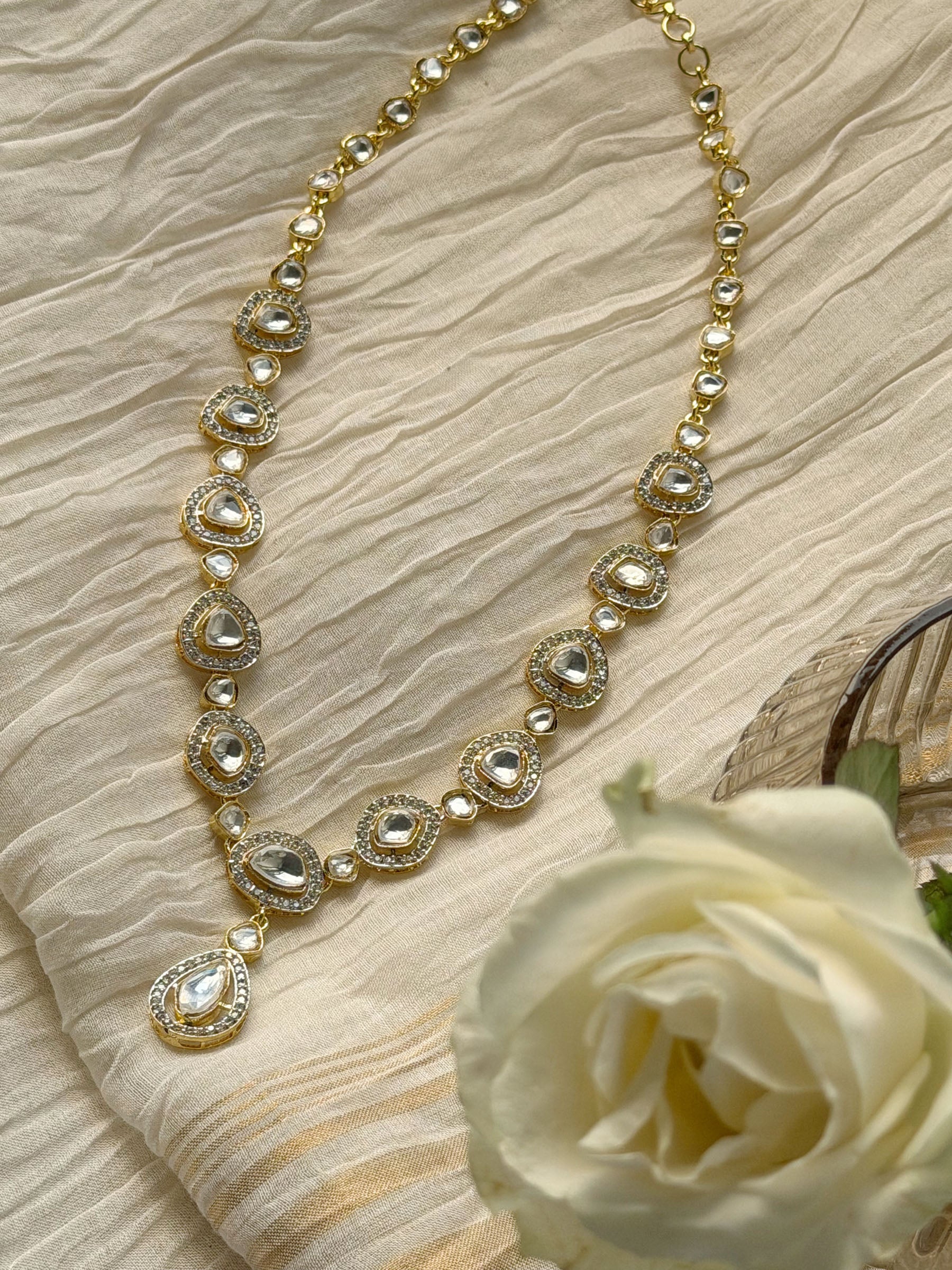A luminous teardrop motif shapes the Vidya Teardrop Statement Necklace Set, creating a radiant highlight for festive attire. Eye-catching and celebratory, it steals the spotlight every time.