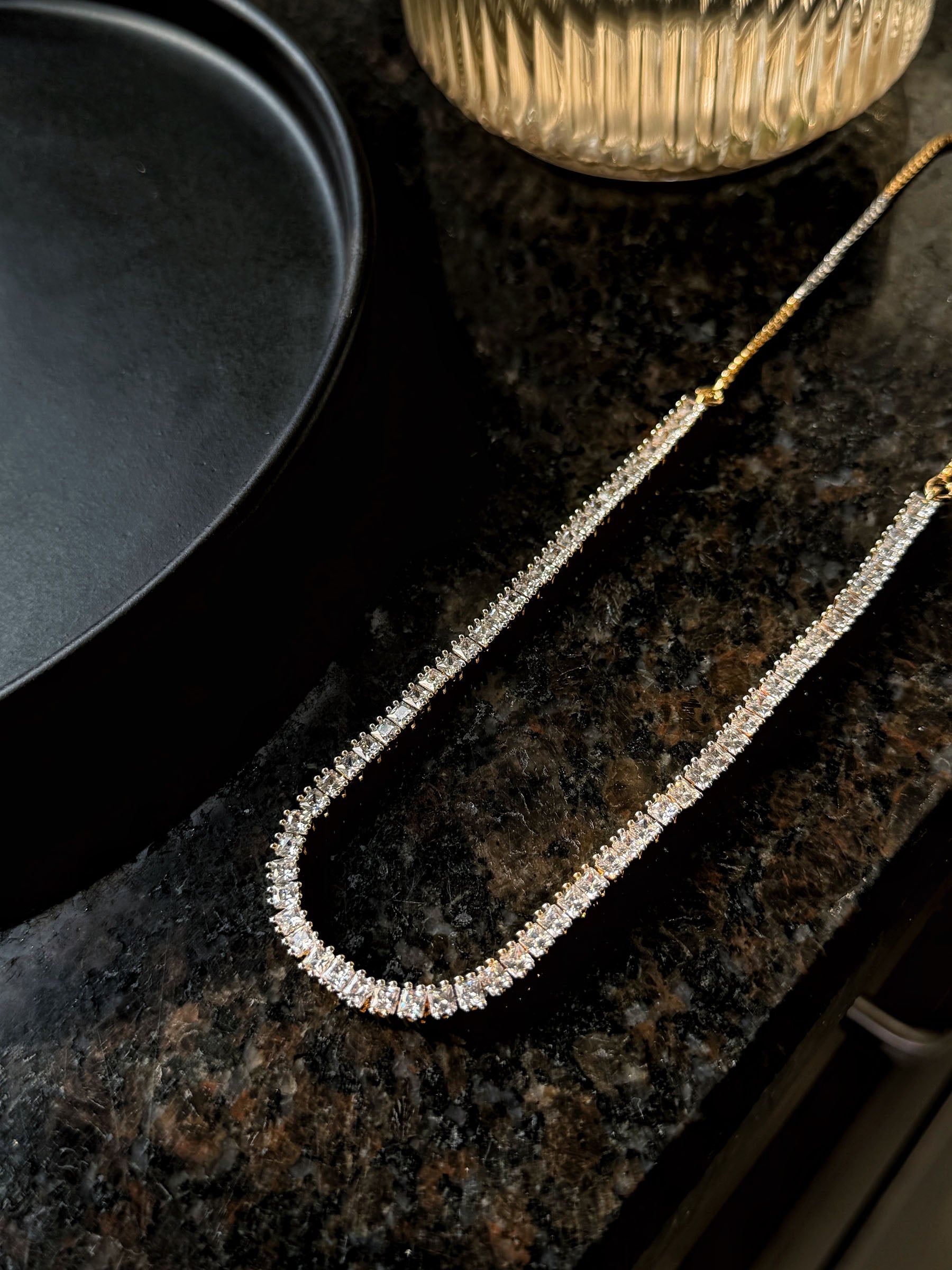A flowing line of sparkling zircons gives the Zircon Stream Muse Necklace Set its fluid brilliance. Lightweight and luminous, it feels elegant without effort.